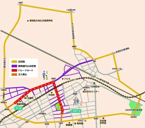 パレードは刈谷市役所周辺(大手町交差点~新栄町交差点)で、沿道の両側に観覧エリアが設けられます。