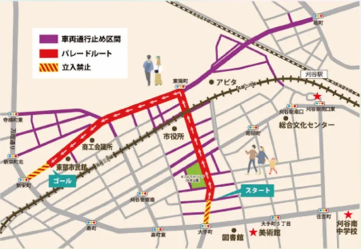パレードは刈谷市役所周辺(大手町交差点~新栄町交差点)で、沿道の両側に観覧エリアが設けられます。